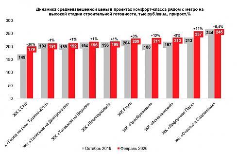 «Наиболее заметный рост цен за полгода в новостройках у метро был зафиксирован в проекте L’Club – с октября 2019 года он составил 20%, с 149 до 179 тыс. руб./кв. м. Несмотря на стабильный рост цен в проекте на протяжении полугода комплекс пользовался активным спросом у покупателей, - комментирует Владимир Моребис, партнер, коммерческий директор компании Est-a-Tet. - Также высокий ценовой прирост отмечен в ЖК «Преображение» - меньше, чем за полгода, он составил 12%, с 188 до 211 тыс. руб./кв. м, а также в ЖК «Лефортово Парк» - с 213 до 237 тыс. руб./кв. м».