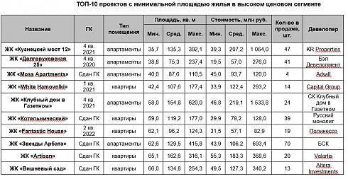 Также в ТОП-10 вошли такие проекты как: ЖК «Котельнический», ЖК «Звезды Арбата», ЖК «Artisan» и ЖК «Вишневый сад» - это комплексы, уже введенные в эксплуатацию, а также строящийся проект ЖК «Fantastic House» с предложением покупки квартир площадью от 62,1 кв. м, такую квартиру можно приобрести за 31,5 млн рублей.