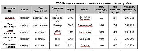 Самый маленький по площади лот зафиксирован в проекте комфорт-класса «Дегунин» – это апартаменты площадью от 9,6 кв. м стоимостью 2,1 млн рублей. Более «просторные» апартаменты можно найти в ЖК «YES Технопарк», их площадь составляет 18,6 кв. м, а бюджет – 7,4 млн рублей, незначительно больше предложение в ЖК Level Амурская - квартира 18,9 кв. м стоит 4,9 млн рублей. В пятерку проектов с минимальными по площади квартирами также вошли проекты «Мещерский лес» и «Академика Павлова» от девелопера ГК ПИК. Минимальные площади в них варьируются от 18,9 до 19,6 кв. м, а бюджеты – от 5,5 до 6,7 млн рублей.
