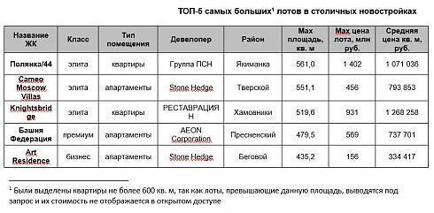 Одна из самых больших квартир реализуется в проекте «Полянка/44» от Группы ПСН, расположенном в ЦАО, в районе Якиманка. В данном комплексе можно приобрести квартиры до 561 кв. м стоимостью до 1,4 млрд рублей. Вторую позицию занимает уникальный проект от Stone Hedge - Cameo Moscow Villas, в котором можно приобрести интересные варианты жилья площадью до 551,1 кв. м, - к примеру трехэтажную виллу бюджетом 455,7 млн рублей. Замыкает тройку комплексов с большими по площади лотами проект Knightsbridge с максимальной площадью в реализации – 519,6 кв. м, цена такого лота составляет 931 млн рублей. В пятерку лидеров также вошли Башня Федерация и Art Residense, площадь апартаментов в них варьируется от 479,5 до 435,2 кв. м соответственно.
