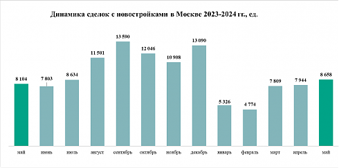 В мае 2024 года число сделок на рынке новостроек относительно апреля увеличилось на 9%. Одновременно, по подсчетам аналитиков «Метриум», основанных на свежих данных Росреестра Москвы, количество ипотечных кредитов скорректировалось вниз на 1%, а договоров купли-продажи – на 13%.