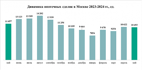 Количество ипотечных сделок в мае 2024 года в Москве незначительно снизилось. Заемщики получили в банках на покупку первичного и вторичного жилья 10,5 тыс. кредитов, что на 1% меньше, чем месяцем ранее, когда Росреестр зарегистрировал 10,6 тыс. ипотечных сделок. Однако по сравнению с маем 2023 года покупатели жилья в Москве получили на 10% меньше кредитов.
