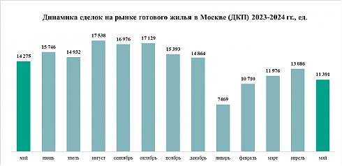 На рынке готового жилья (квартиры от частных владельцев и готовые новостройки от девелоперов) в мае 2024 года число сделок снизилось на 13%. Росреестр зарегистрировал 11,3 тыс. договоров купли-продажи против 13,1 тыс. соглашений в апреле. В то же время по сравнению с маем 2023 года активность покупателей готового жилья в столице снизилась на 20%.
