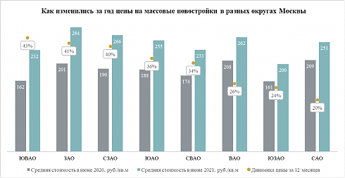 В четырех административных округах столицы массовые новостройки дорожали быстрее, чем в среднем по рынку. Заметнее всего выросли цены в Юго-Восточном административном округе (ЮВАО), где год назад квадратный метр продавался за 162 тыс. рублей, а теперь его стоимость достигла 232 тыс. рублей, то есть на 43% больше, чем в июне 2020 года.