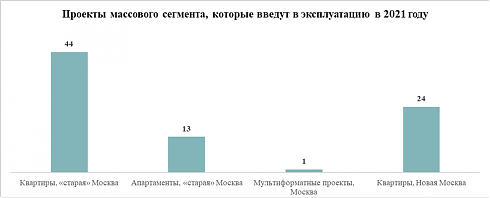 В 2021 году девелоперы предполагают полностью или частично завершить реализацию 82 проектов новостроек эконом- и комфорт-класса в Москве. В текущем году в «старой» Москве будут введены в эксплуатацию корпуса 44 комплексов, а в Новой Москве – 24. Среди них – 13 проектов апартаментов и один мультиформатный комплекс, то есть в нём есть как квартиры, так и апартаменты (ЖК «Летний сад» учтен в статистике жилых и апартаментных комплексов «старой» Москвы).