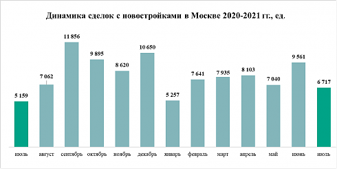 В июле Росреестр Москвы зарегистрировал 6,7 тыс. договоров участия в долевом строительстве, что на 30% меньше, чем в июне (9,6 тыс.), но на 30% больше, чем в июле 2020 года (5,2 тыс. сделок). Таким образом, по мнению экспертов «Метруим», в июле спрос на строящееся жилье в столице сократился относительно предыдущего месяца, но в целом остался на высоком уровне, так как в июле прошлых лет сделок было меньше: в 2019 году – 5,7 тыс., в 2018 – 6,3 тыс. в 2017 – 3,7 тыс.