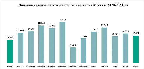 На рынке готового жилья (старые квартиры от собственников и жилье в готовых домах от застройщиков) количество сделок снизилось, но не столь радикально, как на рынке строящегося жилья. По данным Росреестра Москвы, в июле в столице заключили 13,5 тыс. договоров купли-продажи и мены жилья, что на 6% меньше, чем в июне, но на 19% больше, чем в июле 2020 года. Это больше, чем в июле всех предыдущих лет, кроме 2014 года, когда во второй месяц лета в Москве зарегистрировали 14,2 тыс. сделок на вторичном рынке. Таким образом, спрос в этом сегменте также остается высоким, хотя активность клиентов замедляется.