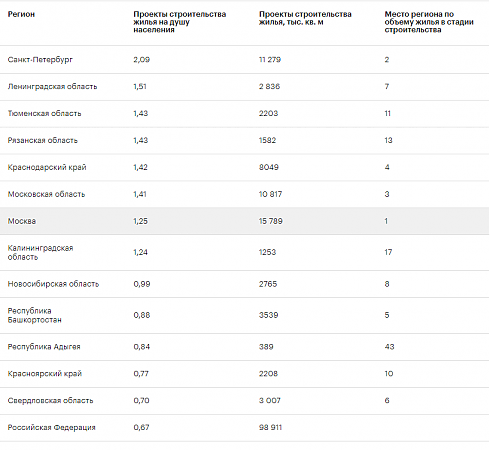 Таблица. Регионы с объемами строительства на душу населения выше среднего по России