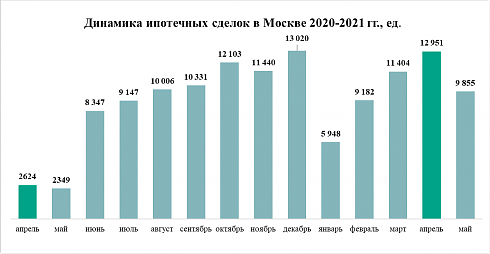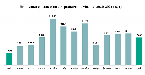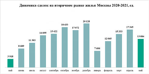 На вторичном рынке также отмечено снижение числа сделок. По данным Росреестра Москвы, в мае покупатели вторичных квартир, а также жилья в готовых новостройках заключили 13,1 тыс. договоров купли-продажи, что на 25% меньше, чем в апреле, когда их число составило 17,4 тыс. Это также сопоставимо со сезонным снижением 2019 года: тогда активность покупателей в этом сегменте за май уменьшилась на 26%. Тем не менее относительно мая 2020 года заключено в 3,3 раза больше договоров купли-продажи.