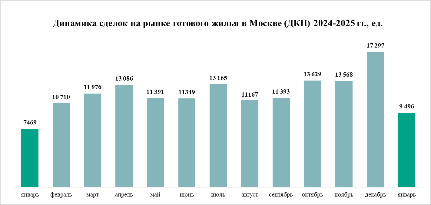 На рынке готового жилья (введенные в эксплуатацию новостройки и вторичное жилье) в январе 2025 года был отмечен заметный рост активности покупателей по сравнению с аналогичным периодом 2024 года. Было зарегистрировано 9,5 тыс. договоров купли-продажи, что на 27% больше, чем в январе 2024 года, когда было зафиксировано 7,5 тыс. сделок. Относительно декабря 2024, когда Росреестр Москвы зарегистрировал 17,3 тыс. соглашений, спрос уменьшился на 45%. В целом результаты января 2025 года оказались сравнительно высокими. В первый месяц текущего года заключили больше соглашений, чем в январе 2020 (8 тыс.), 2021 (7,6 тыс.), 2022 (9,3 тыс.), 2023 (7,7 тыс.) и 2024 (7,5 тыс.), но меньше, чем в январе 2019 года (9,9 тыс.).
