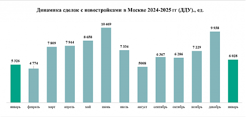 В январе 2025 года, согласно данным Росреестра Москвы, количество сделок на рынке строящегося жилья составило 6 тыс. договоров долевого участия (ДДУ), что на 13% больше, чем в январе 2024 года, когда было зафиксировано 5,3 тыс. ДДУ. Относительно декабря 2024 года число соглашений снизилось на 39%, что характерно для зимнего периода, когда в первом году месяца спрос резко падает относительно последнего месяца предыдущего года. По сравнению с январем прошлых лет результаты первого месяца 2025 года выглядят неплохо: больше сделок было зафиксировано только в январе 2022 года (6,8 тыс.), тогда как во все прочие сопоставимые периоды спрос был ниже.