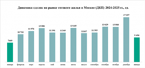На рынке готового жилья (введенные в эксплуатацию новостройки и вторичное жилье) в январе 2025 года был отмечен заметный рост активности покупателей по сравнению с аналогичным периодом 2024 года. Было зарегистрировано 9,5 тыс. договоров купли-продажи, что на 27% больше, чем в январе 2024 года, когда было зафиксировано 7,5 тыс. сделок. Относительно декабря 2024, когда Росреестр Москвы зарегистрировал 17,3 тыс. соглашений, спрос уменьшился на 45%. В целом результаты января 2025 года оказались сравнительно высокими. В первый месяц текущего года заключили больше соглашений, чем в январе 2020 (8 тыс.), 2021 (7,6 тыс.), 2022 (9,3 тыс.), 2023 (7,7 тыс.) и 2024 (7,5 тыс.), но меньше, чем в январе 2019 года (9,9 тыс.).