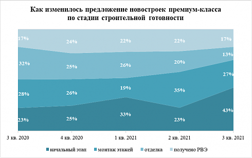 В ноябре 2021 года девелоперы нарастили предложение премиальных новостроек на начальном этапе строительства до 43% от общего объема этого сегмента рынка, подсчитали аналитики «Метриум». Это рекордное значение с 2018 года. При этом в готовых домах премиум-класса на выбор у покупателей менее 17% вариантов квартир и апартаментов.