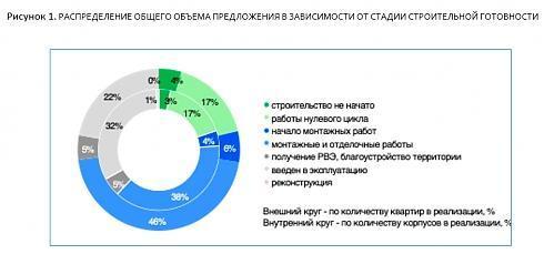 Из этого объема экспозиции более половины лотов реализуется в проектах, находящихся на стадии монтажно-отделочных работ, в уже сданных домах предлагается 22% от общего количества квартир и апартаментов в продаже, однако доля предложения в проектах на начальных этапах строительства (работы не начаты и нулевой цикл) тоже значительная – 21% (рисунок 1).