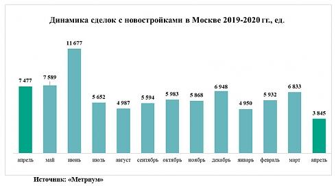 В апреле 2020 года в Москве было заключено 3,9 тыс. договоров участия в долевом строительстве жилья (ДДУ). По сравнению с мартом 2020 года, когда Росреестр зарегистрировал 6,8 тыс. ДДУ, активность дольщиков сократилась на 44%, подсчитали аналитики «Метриум». При этом в годовом выражении количество ДДУ снизилось на 49% (в апреле 2019 года было заключено 7,5 тыс. сделок с новостройками).