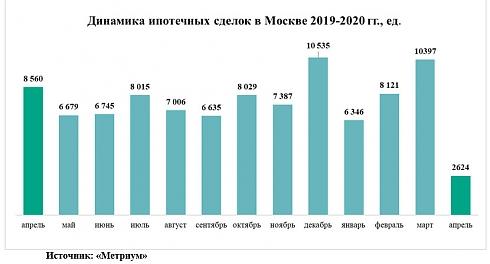 Резкий обвал был зафиксирован и на рынке ипотечных сделок в Москве. Росреестр зарегистрировал 2,6 тыс. договоров, что на 75% меньше, чем в марте. По сравнению с апрелем 2019, активность заемщиков жилищных кредитов также заметно снизилась (на 69%, так как год назад в апреле зафиксировали 8,6 тыс. сделок). Столь малое число сделок на рынке ипотеки не отмечалось с января 2017 года, когда в Москве заключили всего 1,9 тыс. сделок с привлечением кредита.