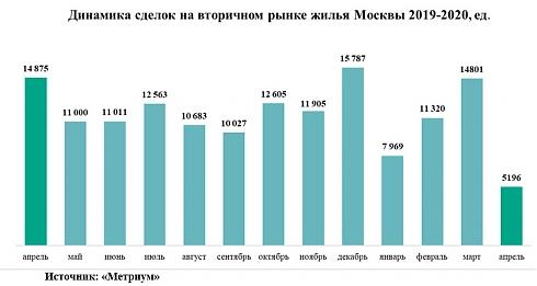 На вторичном рынке жилья в апреле 2020 года ситуация также ухудшилась. В этот период в Москве заключили 5,2 тыс. договоров купли-продажи жилья, что на 65% меньше, чем в марте 2020 года. В такой же степени изменилось число сделок и в годовом выражении: в апреле 2019 года в столице зарегистрировали 14,9 тыс. договоров купли-продажи. Ниже текущих показателей активность покупателей была за прошедший период только в январе 2017 года (4,8 тыс. сделок).