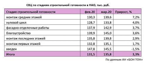 Основная доля предложения в НАО (62,2%) находится на начальной стадии строительной готовности (котлован и первые этажи). За месяц доля предложения на нулевом цикле выросла на 4,7%, а объем – на 30% в связи с выходом нового предложения. Но это не способствовало снижению средней цены «квадрата», т.к. застройщики выводили новые объемы с более высокой ценовой базой. В марте отмечается прирост СВЦ на стадии нулевого цикла на 4%, с 128,7 тыс. руб. до 133,8 тыс. руб.