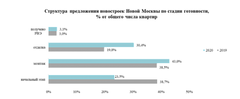 К концу 2020 года в новостройках Новой Москвы застройщики предлагали покупателям 9,2 тыс. квартир, что сопоставимо с уровнем предложения аналогичного периода 2019 года (9,3 тыс. единиц). Однако структура предложения за прошедшие 12 месяцев кардинально изменилась: квартир в домах на котловане стало значительно меньше.