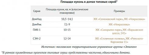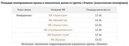 В монолитных домах все изолированные кухни имеют неплохие «человеческие» метражи, но многое зависит от класса жилья: в массовом сегменте при классической планировке их площади варьируется от 11 до 16 кв. м, в бизнес-классе – 12-20 кв. м, отмечают эксперты московского территориального управления группы «Эталон» и приводят примеры из «портфеля» компании (см. таблицу):