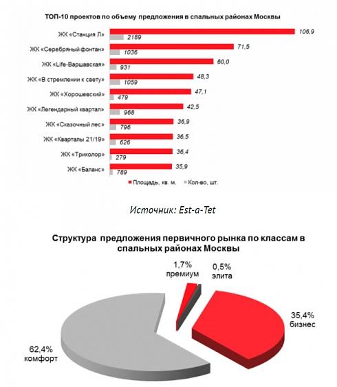 Данные экспертов о количестве продаваемого в спальных районах жилья несколько разнятся. По информации Est-a-Tet, общая его площадь - 1,9 млн кв. м, то есть 207 жилых комплексов, или 606 корпусов. В «Азбуке Жилья» приводят цифру 1,537 млн кв. м (156 ЖК и 451 корпус). У АН «Бон Тон» цифра поменьше - 1,2 млн кв. м, что составляет 67% от предложения квартир на первичном рынке старой Москвы. Большая часть экспозиции находится в трех округах: ЮВАО (25,7%), СВАО (20%) и САО (14,9%).