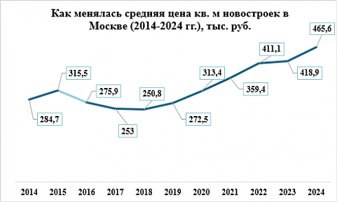 Средняя цена квадратного метра на первичном рынке Москвы во II квартале 2024 года составляет 465,6 тысяч рублей. По данным «Метриум», за прошедшие пять лет этот показатель вырос на 70,9%. Для сравнения, в 2014-2019 гг. квадратный метр в столичных новостройках, напротив, подешевел на 4,3%.