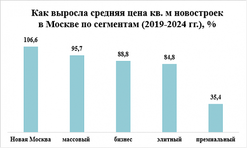 В 2019-2024 гг. рост цен охватил весь первичный рынок Москвы. Но в разрезе сегментов динамика выглядит неоднозначно. Согласно данным «Метриум», в массовом сегменте за минувшие пять лет квадратный метр подорожал на 95,7% (до 326,1 тысяч рублей), в бизнес-классе – на 88,8% (до 449,7 тысяч рублей), в премиум-классе – на 35,4% (до 663,8 тысяч рублей), в элитном сегменте – на 84,8% (до 1,8 млн рублей), в Новой Москве – на 106,6% (до 245 тысяч рублей).