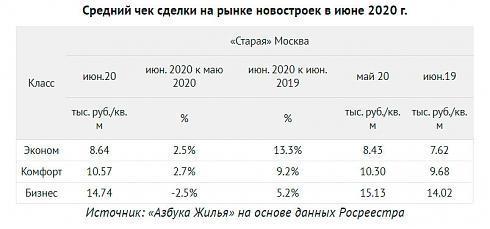 Согласно подсчётам «Бон Тон», цены выросли еще более существенно - в связи с увеличением стадии строительной готовности проектов, активизацией спроса и снижением ипотечных ставок. По данным компании, в июне 2020 г. средневзвешенная цена квадратного метра на рынке новостроек комфорткласса «старой» Москвы составила 183,8 тыс. руб., что на 3% и 17% больше, чем, соответственно, в мае 2020-го и июне 2019-го. Бизнес-класс в июне стоил в среднем 240,5 тыс. руб. за метр, то есть подорожал на 4,6% и 16,3%.