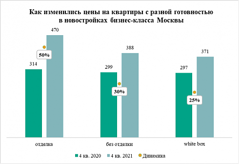 В жилых комплексах бизнес-класса в Москве наблюдались такие же тенденции. За 2021 год квартиры с отделкой в новостройках бизнес-класса в Москве стали дороже на 50%. Если в феврале средняя стоимость квадратного метра в них составляла 314 тыс. рублей, то в конце февраля этот показатель вырос до 470 тыс. рублей.