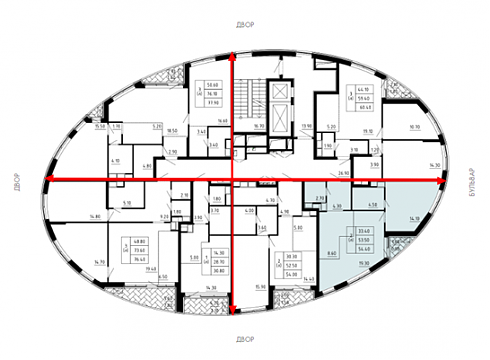 Итогом работы приглашенных экспертов стали два корпуса овальной формы – 2C (Дом Вики Газинской) и 4A (Дом Валерия Гергиева). Каждый этаж имеет соответственно закругленную фасадную стену и прямые внутренние перегородки. Причем крестообразные оси, разделяющие квартиры, не упираются в вершины овала, а смещены вправо. Так у клиента появляется выбор между квартирами с более плавной или более ярко выраженной дугой фасадной стены.