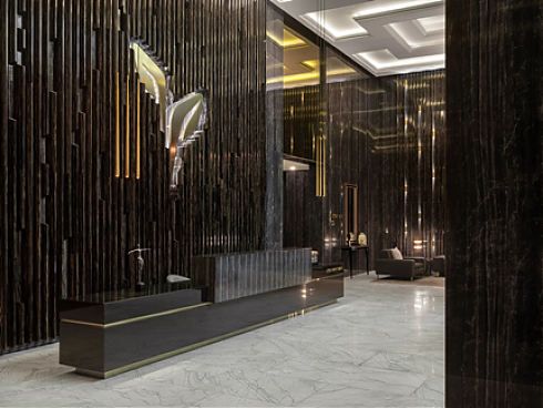 В премиальном квартале «Прайм Парк» девелопер привлек для создания архитектуры и интерьеров известное британское бюро Dyer, а также выбрал для отделки помещений лобби дорогие и редкие материалы. К примеру, пол покрыт бразильским кварцевым гранитом, а стены за зоной ресепшн украшены ламелями из редкой породы дерева Макасар. Освещает помещение люстра, изготовленная по специальному заказу девелопера.