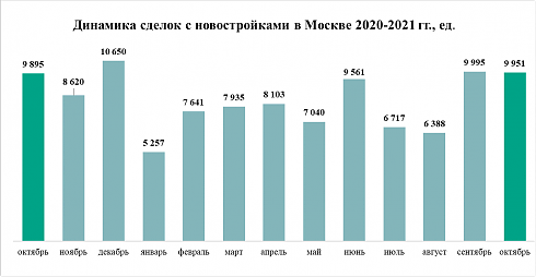 В октябре Росреестр Москвы зарегистрировал почти 10 тыс. договоров участия в долевом строительстве, что совпадает с результатами продаж строящегося жилья в сентябре, то есть в целом активность покупателей остается на высоком уровне, заметно превышающим показатели июля и августа. По сравнению с октябрем 2020 года число заключенных в Москве ДДУ также практически не изменилось.