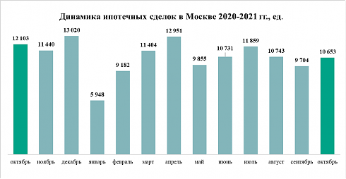 В октябре банки отыграли сентябрьское падение числа выданных ипотечных сделок в Москве. В этом месяце заемщики в столице получили 10,7 тыс. ипотечных кредитов, что на 10% больше, чем в сентябре (9,7 тыс.). Фактически спрос на жилищные кредиты вернулся на уровень июля (10,7 тыс.), что можно расценивать как стабилизацию активности клиентов. Тем не менее, по сравнению с октябрем 2020 года количество сделок в минувшем октябре оказалось на 12% меньше. Иными словами, спрос на ипотеку в Москве стабилизировался на относительно высоком уровне, но уже ниже рекордных значений прошлого года.