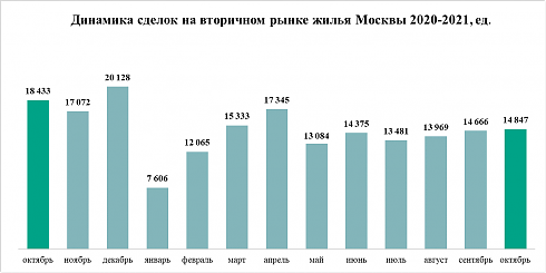 На рынке готового жилья (квартиры от частных собственников и жилье в готовых домах от застройщиков) количество сделок выросло на 1% относительно сентября. В октябре в столице заключили 14,9 тыс. договоров купли-продажи и мены жилья, а в сентябре – 14,7 тысяч. Таким образом, в октябре на вторичном рынке зафиксирован самый высокий в 2021 году показатель числа сделок с апреля. Однако рекорды прошлого года побить не удалось. По сравнению с октябрем 2020 года текущее количество сделок уменьшилось на 19%. Таким образом, в этом секторе рынка жилья Москвы наблюдается стабилизация с перспективой роста активности клиентов.