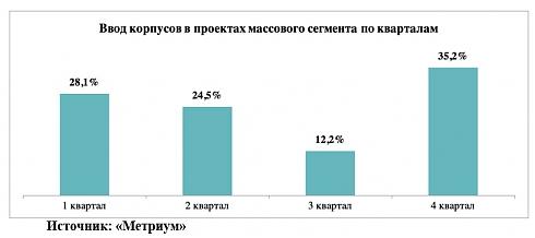 Самая представительная группа в массовом сегменте – это жилые комплексы с квартирами, реализуемые на территории «старой» Москвы. В общей сложности в нее входят 40 проектов и 79 корпусов. 17 из них запланированы к вводу на 1 квартал, 36 корпусов – на последний. При этом на второй и третий кварталы должно прийтись равное количество вводимых зданий – по 13 корпусов.