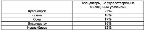 В среднем 17% жителей крупных региональных центров, живущих в арендных квартирах или апартаментах, не удовлетворены жилищными условиями. Об этом говорится в совместном исследовании ДОМ.РФ и ВЦИОМ, проведенном во Владивостоке, Казани, Красноярске, Новосибирске и Сочи. Больше всего семей, недовольных условиями аренды, проживает в Красноярске — 24%, меньше всего в Новосибирске — 12%.