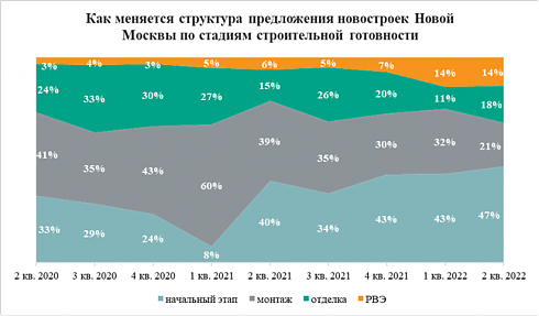 Во II квартале 2022 года на рынке новостроек Новой Москвы застройщики продавали более 12 тыс. квартир. Большую часть из них девелоперы предлагали приобрести дольщикам на стадии котлована. Доля таких квартир достигла 47%, то есть почти половины от суммарного объема предложения.