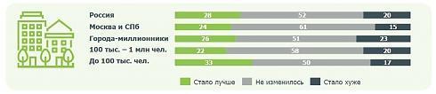 Позитивные изменения горсреды чаще отмечали в Южном федеральном округе (40% респондентов). Меньше оптимизма продемонстрировали жители Сибири (15%). Мнение сибиряков отчасти связано с климатическими условиями: долгие зимы и перепады температур усложняют содержание дорог, тротуаров и дворов, на которые прежде всего обращают внимание люди.