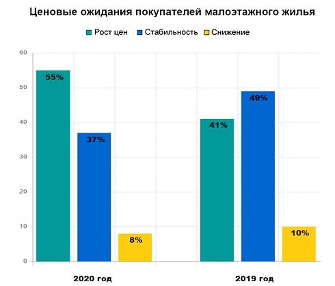 Аналитики фи-девелоперской компании KASKAD Недвижимость провели опрос среди потенциальных покупателей жилья в загородных комплексах компании об их планах выйти на сделку, ценовых ожиданиях и отношении к текущему кризису. Согласно опросу, большинство респондентов – 55% – ожидают роста цен на загородное жилье в течение 2020 года. Для сравнения, в 2019 году роста цен ожидал 41% опрошенных, а в 2017 году – всего 26%.