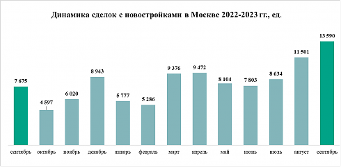 В сентябре 2023 года Росреестр Москвы зарегистрировал 13,6 тыс. договоров участия в долевом строительстве жилья (ДДУ), что на 18% больше, чем в предыдущем месяце и на 77% больше, чем в сентябре 2022 года. По абсолютному числу сделок в сентябре застройщики побили предыдущий августовский абсолютный рекорд за всю историю наблюдений. Всего за девять месяцев 2023 года в Москве дольщики и застройщики заключили почти 80 тыс. ДДУ, что на 21% больше, чем в аналогичный период 2022 года.