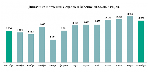 Число ипотечных сделок в сентябре в Москве заметно сократилось. Банки выдали покупателям жилья (как первичного, так и вторичного) 12,9 тыс. кредитов, что на 9% меньше, чем в августе, но на 32% больше, чем в сентябре 2022 года, когда было зарегистрировано 9,8 тыс. ипотечных сделок. Всего за девять месяцев 2023 года покупатели жилья в Москве получили более 105 тыс. ипотечных кредитов, что на 33% больше, чем в аналогичный период 2022 года.
