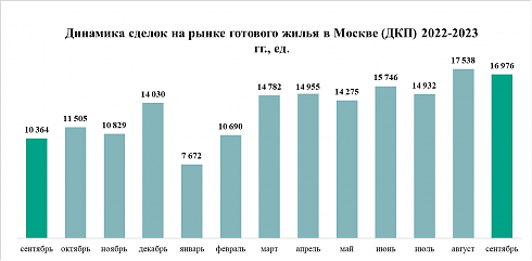 На рынке готового жилья (квартиры от частных владельцев и готовые новостройки от девелоперов) в сентябре был зафиксирован спад. Росреестр зарегистрировал почти 17 тысяч договоров купли-продажи (ДКП), что на 3% меньше, чем в августе. По сравнению с сентябрем 2022 года число сделок увеличилось на 64%. С начала года покупатели готового жилья в Москве заключили 128 тыс. соглашений, что на 33% больше, чем в такой же период 2022 года.