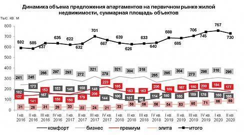 По данным аналитиков департамента проектного консалтинга Est-a-Tet, на сегодняшний день доля апартаментов на первичном рынке жилой недвижимости столицы составляет 25% от суммарной площади лотов, в предыдущем квартале на данный формат приходилось 26,9%. В продаже представлено 9,8 тыс. апартаментов общей площадью 729,8 тыс. кв. м в 119 проектах, по сравнению с предыдущим кварталом объем предложения в квадратных метрах уменьшился на 3,6%, за год вырос на 6,6%. При этом наибольшую долю занимает бизнес-класс (40,8%), на премиум-класс приходится 24,3%, на комфорт-класс и элитный сегмент – 22,8% и 12,1% соответственно.