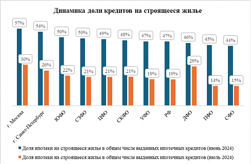 В Москве доля ипотечных кредитов на долевое строительство снизилась с 57% до 30%, а в Санкт-Петербурге — с 54% до 26%