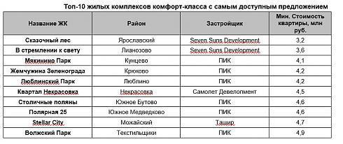 Самые привлекательные по цене квартиры реализуются в проектах от застройщика Seven Suns Development – «Сказочный лес», в котором стартовый бюджет составляет 3,2 млн рублей, и «В стремлении к свету» - в нем цены начинаются от 3,6 млн рублей. Лоты стоимостью до 4,3 млн рублей можно найти в комплексах от ГК ПИК – «Мякинино Парк», «Жемчужина Зеленограда» и «Люблинский Парк».