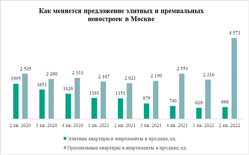 Впрочем, такой резкий рост предложения произошел только во II квартале, когда девелоперы запустили много новых проектов премиум-класса. При этом с середины 2021 года до второго квартала 2022 года объем предложения на рынке новостроек премиум-класса не превышал 2,6 тыс. квартир и апартаментов.
