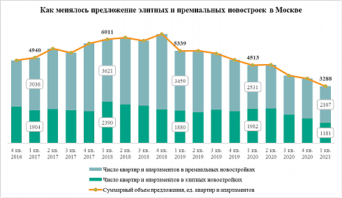 В I квартале 2021 года в Москве девелоперы продавали 3,3 тыс. квартир и апартаментов в комплексах, относящихся к элитному и премиальному сегментам рынка новостроек. Это самый низкий уровень предложения дорогого жилья в столице, зафиксированный с 2016 года. По подсчетам аналитиков «Метриум», за последний год этот показатель сократился на 27%, что стало самым резким годовым падением за пять лет.