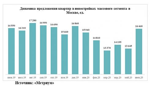 С начала года объем предложения сокращался. В декабре 2019 года столичные застройщики продавали 16,9 тыс. квартир, в январе 2020 года – 15,9 тыс., в феврале – 14,8 тыс., в марте – 13,4 тыс. ед. Затем показатель увеличился в апреле до 14,2 тыс., в мае сократился до 13,7 тыс., а в июне резко вырос до 16,5 тыс.