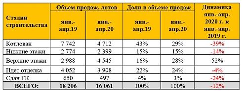 Снижение продаж произошло на всех стадиях реализации жилых корпусов. Наибольшее снижение продаж зафиксировано на стадии котлована. По сравнению с январем-апрелем 2019 года оно составило 39%. При этом несмотря на общее снижение числа сделок, объем продаж на стадии верхних этажей увеличился на 52%. Единственная стадия строительства с положительной динамикой.