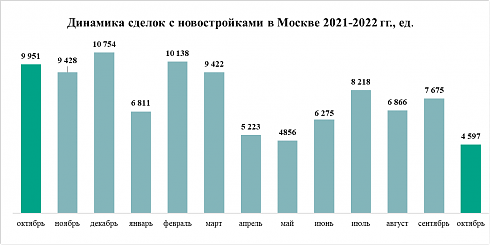 В октябре участники долевого строительства, по данным Росреестра Москвы, заключили в Москве 4,6 тыс. ДДУ, что на 40% меньше, чем в сентябре, когда было зарегистрировано 7,7 тыс. ДДУ. По сравнению с октябрем 2021 года число сделок упало на 54%.